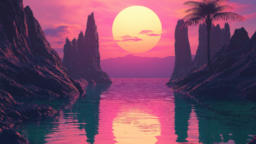 WonderMuralYksinomainen tapettimme esittelee eloisaa tropiikin auringonlaskua, jossa vaaleanpunainen ja oranssi aurinko heijastuu idyllisen maiseman tyyniin v...