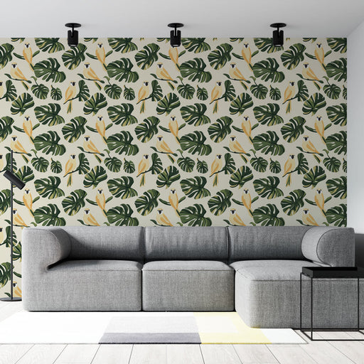 WonderMuralTämä tapetti herättää trooppisen tunnelman värikkäällä runsaiden lehtien ja pastellinkeltaisten papukaijojen kuvioinnillaan. Monstera-lehdet kietou...