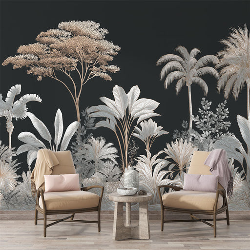 WonderMuralTämä kaunis tapetti esittelee lumoavan trooppisen kuvion, joka koostuu mustista palmupuista, joita korostavat herkät vaaleanpunaiset sävyt kermanvä...
