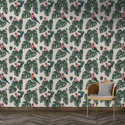 WonderMuralUpea Tapetti-omme sisältää leikkisän kuvion vaaleanpunaisista linnuista, jotka ovat pesiytyneet suurten tropiikin lehtien sekaan. Pehmeä ja luonnol...