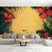 Tämä eloisa tapettimurali näyttää upean kuvion punaisista kukista ja tropiikin lehdistä, luoden kesäisen ja kutsuvan ilmapiirin. Pehmeä keltainen tausta korostaa kukkien ja lehtien värikkäitä värejä, tuoden lämpöä ja elinvoimaa sisustukseesi.