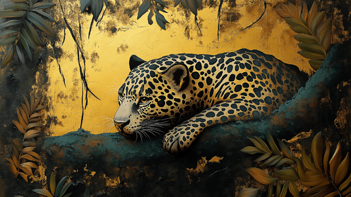 WonderMuralTämä kiehtova tapetti tarjoaa majesteettisen leopardin, joka lepää oksalla rehevän kasvillisuuden ympäröimänä. Kultainen tausta luo ylellisen ja lä...
