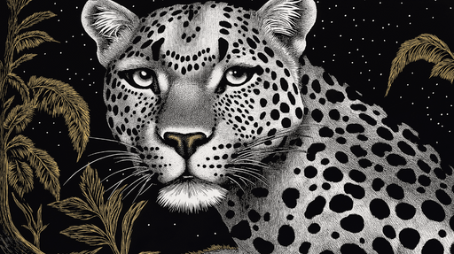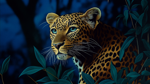 WonderMuralTämä tapetti korostaa mahtavaa leopardia läpitunkevalla katseella, ympäröitynä rehevällä kasvillisuudella yöllisessä tunnelmassa. Hienot yksityisko...
