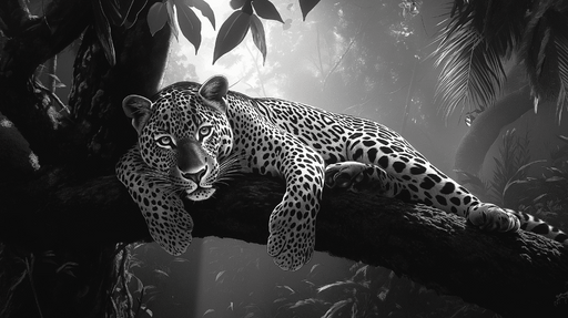 WonderMuralTämä upea tapetti sisältää majesteettisen leopardin, joka makaa oksalla viidakon vehreyden ympäröimänä. Mustan ja valkoisen kontrasti korostaa sen ...