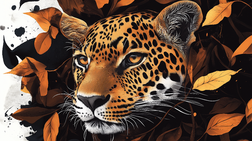 Näytä kaikki tiedotTapetti leopardi | Realistinen kasvokuva ympäröitynä oransseilla ja mustilla lehdillä