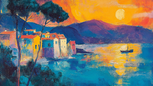 WonderMuralTämä tapetti esittelee lumoavan merimaiseman, jossa kirkkaanväriset talot kiinnittyvät rannikolle, valaistuina loistavalla auringonlaskulla. Lämpim...