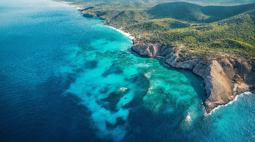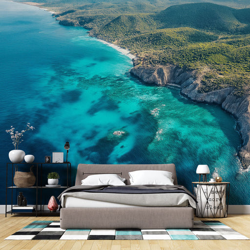 WonderMuralTämä tapetti tarjoaa henkeäsalpaavan ilmasta otetun näkymän merimaisemasta, jossa on useita sinisen sävyjä, korostaen läpikuultavaa merta, joka on ...