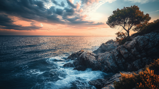 WonderMuralTämä ylevä tapetti esittelee kiehtovan merimaiseman, jossa majesteettiset kalliot kohtaavat kevyesti aaltoilevat aallot värikkään auringonlaskun al...