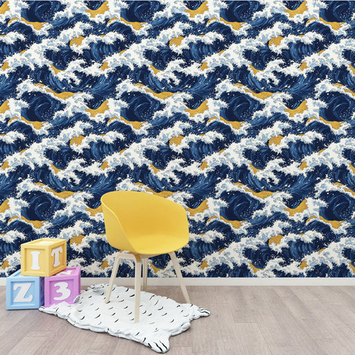 WonderMuralTämä tapetti herättää meren aaltojen voiman ja eleganssin kiehtovalla sinisen, valkoisen ja kultaisen sävyjen yhdistelmällä. Aallot näyttävät tanss...
