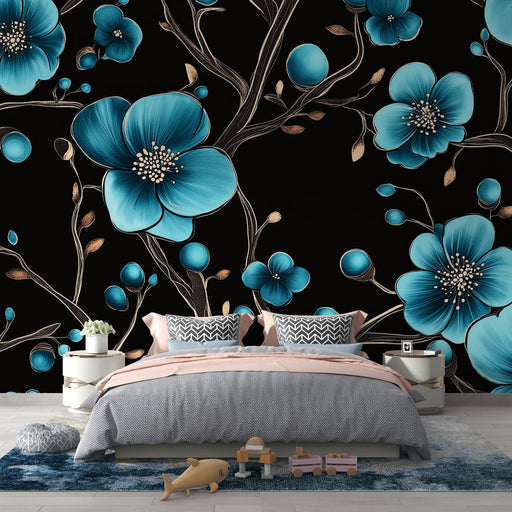WonderMuralTämä tapetti sisältää eläväisen kukkakuviota kirkkailla sinisillä kukilla, jotka on hienosti järjestetty hienojen oksien varrelle syvälle mustalle ...