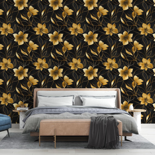 WonderMuralTämä tapettiominaisuus esittelee kauniin kultaisen kukkakuvion syvällä mustalla taustalla, luoden silmiinpistävän kontrastin. Kukat, herkästi piirr...