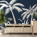 Tämä tapetti, jossa on valkoisten palmujen kuvio syvän sinivihreällä taustalla, luo trooppisen ja rauhoittavan ilmapiirin. Palmujen elegantit siluetit lisäävät hienostuneisuutta ja valaisevat tilaa rohkealla muotoilullaan.