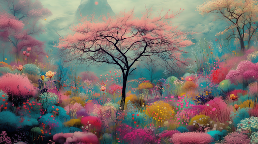 Art'loloKoristele sisätilasi Tapetti satumaisella maisemalla, jossa on mahtipuu vaaleanpunaisten kukkien ympäröimänä värikkään kasvillisuuden keskellä. Täm...