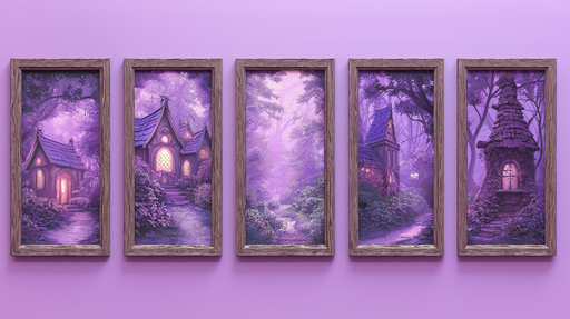 WonderMuralLöydä upea tapetti, joka esittää lumoavia taloja ympäröivän rehevän kasvillisuuden, upotettuna rauhoittaviin violetin sävyihin. Jokainen paneeli he...