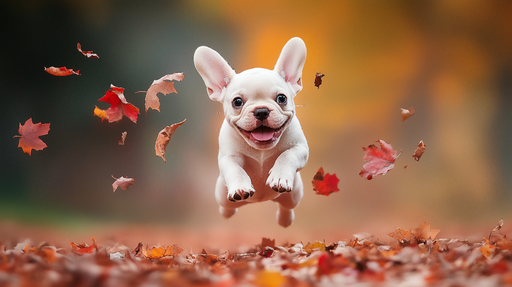 Art'loloTuo sisätiloihisi ripaus syksyistä iloa tällä tapettimuralilla, jossa on suloinen valkoinen bulldoggi hyppimässä värikkäiden syyslehtien keskellä. ...
