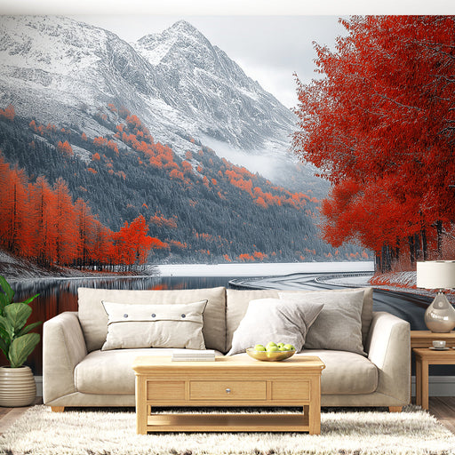 WonderMuralTämä lumoava tapetti kuvaa ajatonta maisemaa, jossa mahtavat vuoret kohtaavat syksyisten puiden pehmeyden. Kirkkaanpunaiset puut seisovat rauhallis...