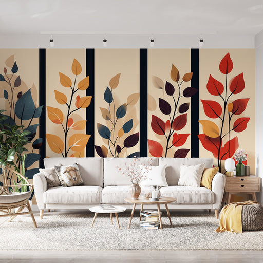 WonderMuralTämä elegantti tapetti esittelee stilisoituja lehtiä sävyissä oranssi, punainen ja sini luoden lämpimän ja kutsuvan tunnelman. Eri lehtikuviot erot...
