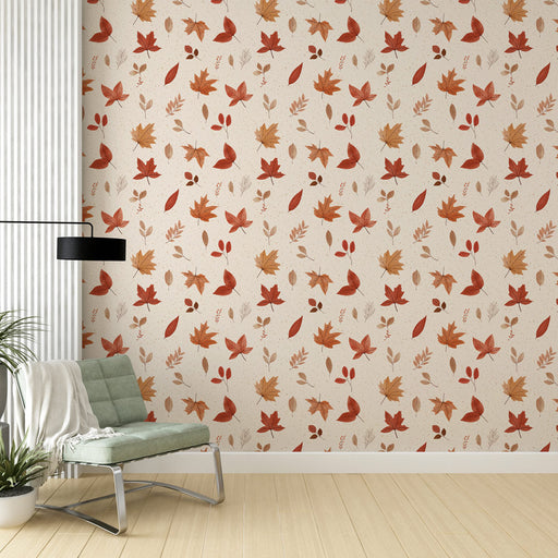 WonderMuralLöydä Tapetti, jonka suunnittelu on inspiroitu luonnosta, ja siinä on herkkä kuvio syksyn lehdistä punaisen, ruskean ja beige sävyissä. Vaalea taus...