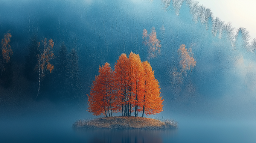 WonderMuralSukella rauhalliseen tunnelmaan seinämaalauksellamme, joka kuvaa syksyistä maisemaa, jossa kaunis saari on koristeltu kirkkaan oransseilla lehdillä...