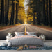 Tapetti syksyinen maisema | Tie, jota reunustavat kultaiset puut pehmeässä valossa
