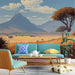 Tämä tapetti esittelee rauhallisen afrikkalaisen maiseman, jossa kultaiset tasangot ja mahtavat vuoret kirkkaan taivaan alla. Ruohon ja puiden lämpimät sävyt luovat rauhoittavan kuvan, täydellisen villin luonnon tuomiseen sisustukseesi.