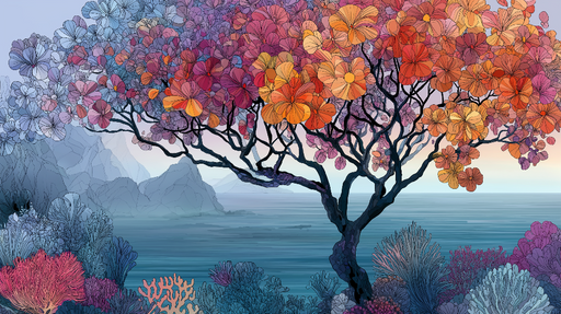 WonderMuralTämä tapetti korostaa mahtavaa puuta eloisilla kukilla lämpimissä sävyissä, erottuen rauhallisesta merimaisemasta. Kukkien violetit, oranssit ja pi...