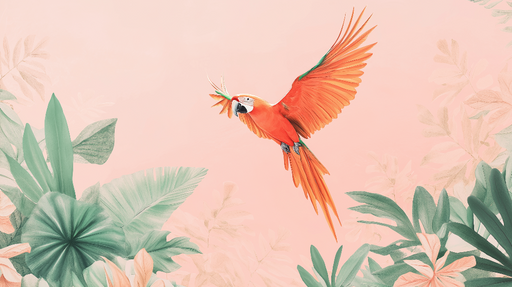 WonderMuralTapettimme korostaa eloisaa papukaijaa, jolla on oranssit höyhenet, liitäen herkän trooppisen kasvillisuuden keskellä. Pehmeä vaaleanpunainen taust...