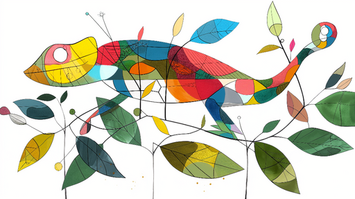 WonderMuralTämä värikäs seinämaalitapetin kuva esittää tyyliteltyä kameleonttia, joka on koristeltu kirkkaiden värien mosaiikilla ja kiipeilee lehtien ja oksi...