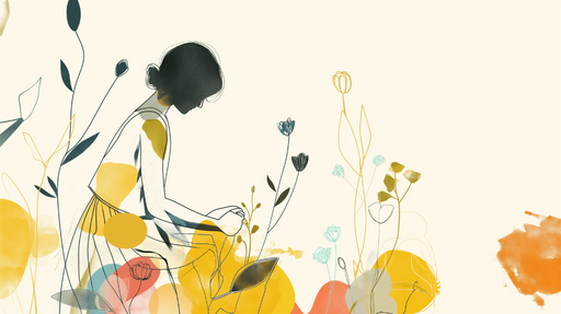 WonderMuralTämä taiteellinen tapetti kuvaa nuorta tyttöä syvässä mietiskelyssä, joka leikkaa herkullisen värisiä kukkia. Puhtaat viivat ja geometriset muodot ...