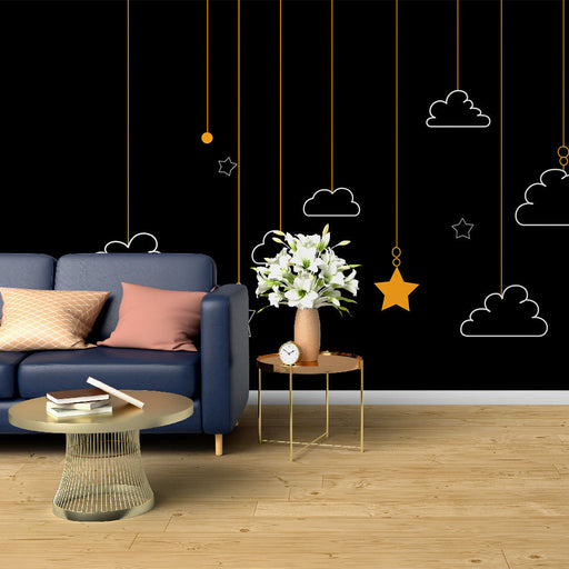 WonderMuralUpea tapettimme on varustettu modernilla suunnittelulla, jossa on valkoisia pilviä ja värikkäitä tähtiä, jotka ovat ripustettu herkillä nauhoilla. ...