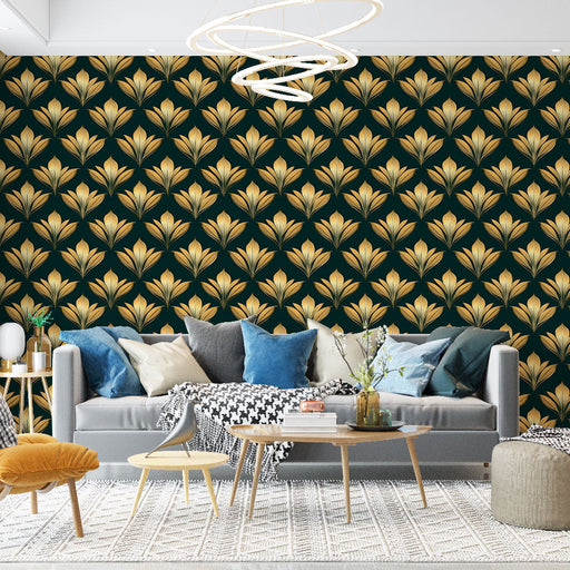 WonderMuralLöydä kultainen kukka tapetti, joka on koristeltu tyylikkäällä kuvioinnilla stilisoituja kultaisia kukkia syvän mustalla taustalla. Tämä väriyhdist...