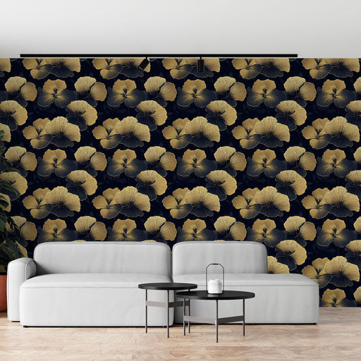 WonderMuralLöydä kultainen kukka-tapetti, joka sisältää elegantin kuvion kultaisista kukista syvän mustalla taustalla. Tämä hienostunut suunnittelu tuo kosket...