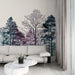Seinämaalimmeessa on kaunis kuvio puun silueteista, joissa yhdistyvät tyylitellyt havupuut ja lehtipuut. Vaihtelevat sävyt sinisestä violettiin luovat rauhoittavan gradienttivaikutelman, kun taas vaalea tausta korostaa suunnittelun pehmeyttä.