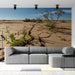 Tämä tapetti kuvaa kiehtovaa kuivaa maisemaa, jossa halkeamat merkitsevät autiomaan lattiaa ja jota täplittävät kestävän kasvillisuuden kosketukset. Beigen ja vihreän sävyt herättävät luonnon, joka on sekä ankara että kaunis, vangiten elinympäristön olemuksen, joka kestää äärimmäisiä olosuhteita.