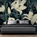 Tämä tapetti korostaa raffinoitua koostumusta valkoisista liljoista, jotka ympäröivät rehevää kasvillisuutta tummalla taustalla, lisäten syvyyttä ja eleganssia mihin tahansa tilaan. Kukkien ja lehtien herkät yksityiskohdat luovat rauhoittavan ja hienostuneen ilmapiirin, joka sopii sekä moderneihin että klassisiin sisätiloihin.