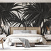 Tämä tyylikäs tapettimainen seinäkuva esittelee kuvion palmunlehtiä mustana, tuoden modernin ja rohkean kosketuksen sisustukseesi. Kontrasti tummien lehtien ja vaalean taustan välillä luo dynaamisen ilmapiirin, joka kiinnittää huomion ja lisää syvyyttä huoneeseen.