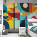 Tämä eloisa ja rohkea tapetti esittelee abstraktin geometrisen kuvion, joka tarttuu välittömästi silmään. Erilaiset geometriset muodot, kuten ympyrät, puolipyöreät, kolmiot ja suorakulmiot, sulautuvat harmonisesti luodakseen dynaamisen kokonaisuuden. Kirkkaat värit, kuten keltainen, sininen, punainen ja pinkki, tuovat iloisuutta ja energiaa tilaan.