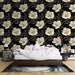 Tapetti valkoisilla ja kultaisilla kukilla | kukkakuvio mustalla taustalla