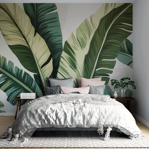 WonderMuralOva veličanstvena tapeta ističe uzorak velikih listova banane u blistavim nijansama zelene, stvarajući umirujući tropski ugođaj. Fini detalji i sup...