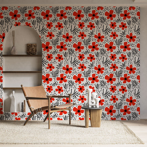 WonderMuralNaša Tapeta prikazuje živopisni uzorak crvenih cvjetova okruženih crnim lišćem i točkicama, nudeći energičan i radostan miks. Ovaj zavodljiv dizajn...