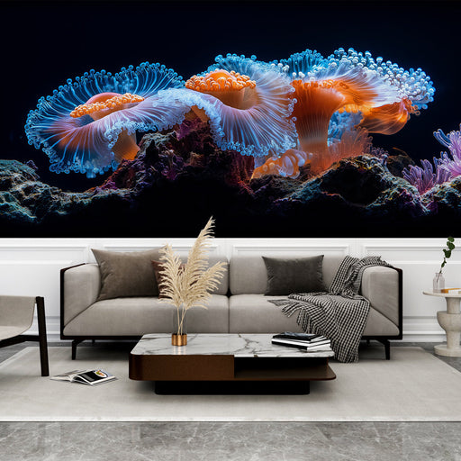 WonderMuralOvaj zapanjujući mural s tapetom prikazuje uzorak meduze, živopisne u nijansama ružičaste i narančaste boje na tamnoj pozadini. Umjetnički i modera...