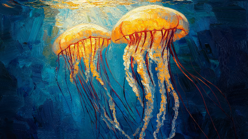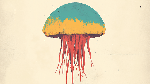 WonderMuralOvaj mural tapet prikazuje veličanstvenu ilustraciju meduze s vibrantnim bojama, kombinirajući nijanse plave, žute i crvene. Smion i umjetnički diz...