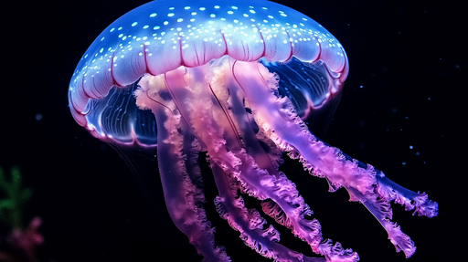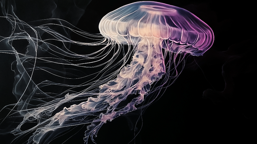 WonderMuralOva zanosna tapeta s muralom prikazuje delikatnu meduzu, ukrašenu živopisnim nijansama ružičaste i lila boje, graciozno plutajući na crnoj pozadini...