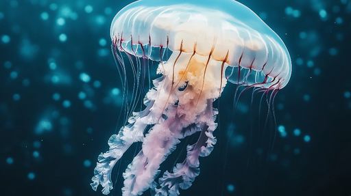 WonderMuralOva veličanstvena tapeta ističe luminescentnu meduzu u nježnim tonovima, nježno plutajući u pastelnim nijansama. Fino izrađeni detalji meduze, od n...