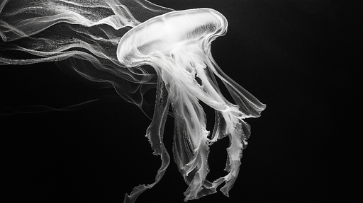 WonderMuralOva muralna tapeta prikazuje veličanstvenu meduzu kako graciozno pliva, uhvaćenu u eteričnom bijelom tonu, ističući se na crnoj pozadini. Fluidni i...