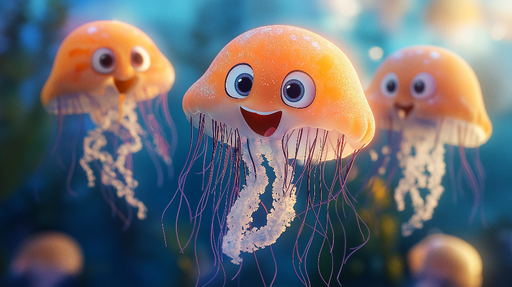 WonderMuralOva muralna tapeta prikazuje igružvane uzorke osmijehom meduza u svijetlim nijansama, krećući se u očaravajućem morskom svemiru. Žive boje, uključu...