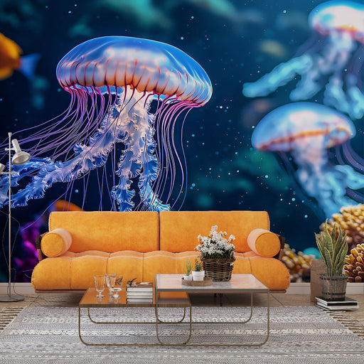 WonderMuralOva zanosna muralna tapeta prikazuje svijetle meduze koje plutaju u morskim dubinama, s živopisnim bojama koje variraju od plave do zlatne. Fino iz...