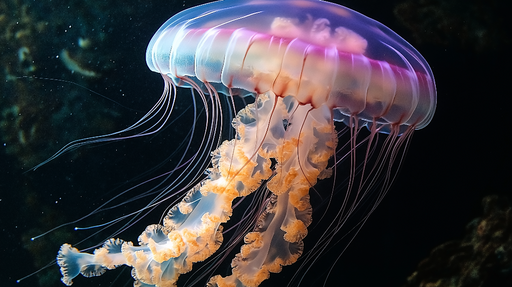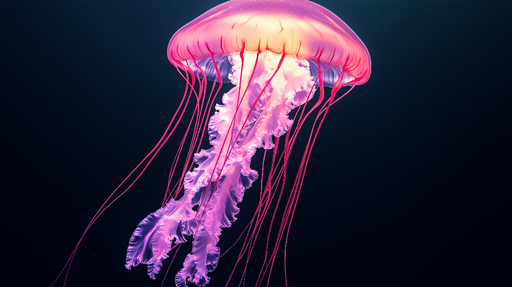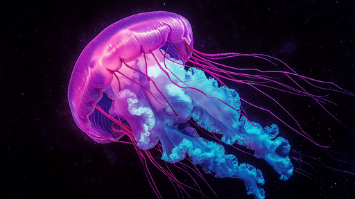 WonderMuralOva zapanjujuća tapeta s muralom prikazuje sjajnu meduzu koja lebdi bez težine, s nijansama ružičaste i plave koje privlače pogled. Tamna pozadina ...