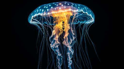 Prikaži sve detaljeTapeta meduza | Elegantan dizajn svijetle meduze na crnoj pozadini