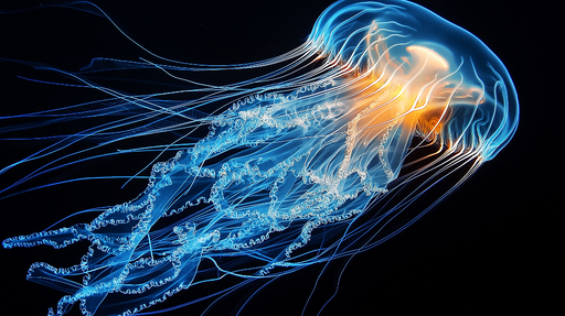 WonderMuralOva muralna tapeta prikazuje zanosni uzorak meduze osvijetljen, graciozno plutajući na crnoj pozadini. Žive boje narančaste i plave stvaraju upečat...